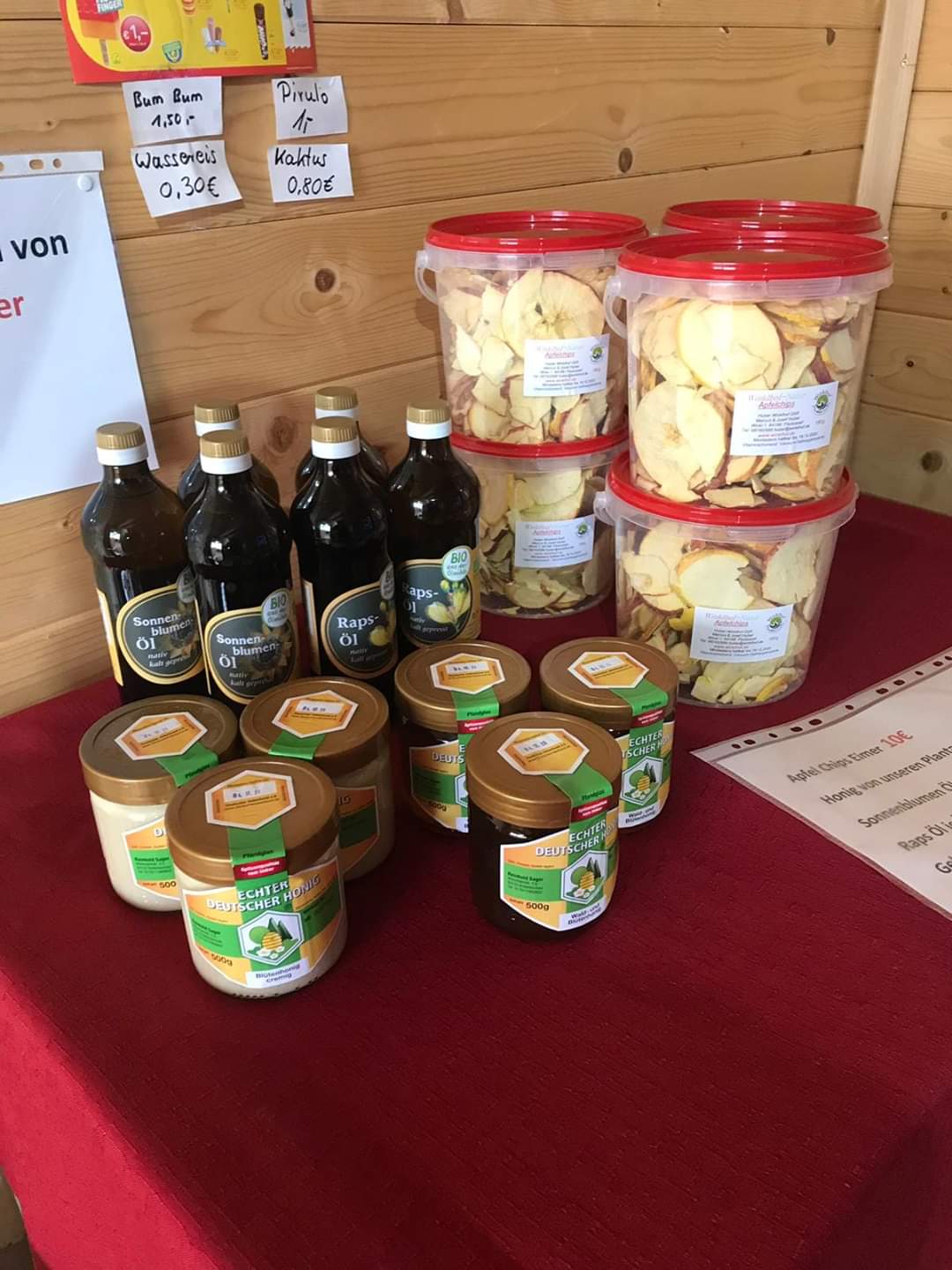 Kaltgetränke, Eis, Apfelchips, Balsam-Essig, Apfelgriebenschmalz, Fruchtpulver, Aroniasaft, Käse, Highland Cattle Wurst, Softeis Automat, Slush Eis.